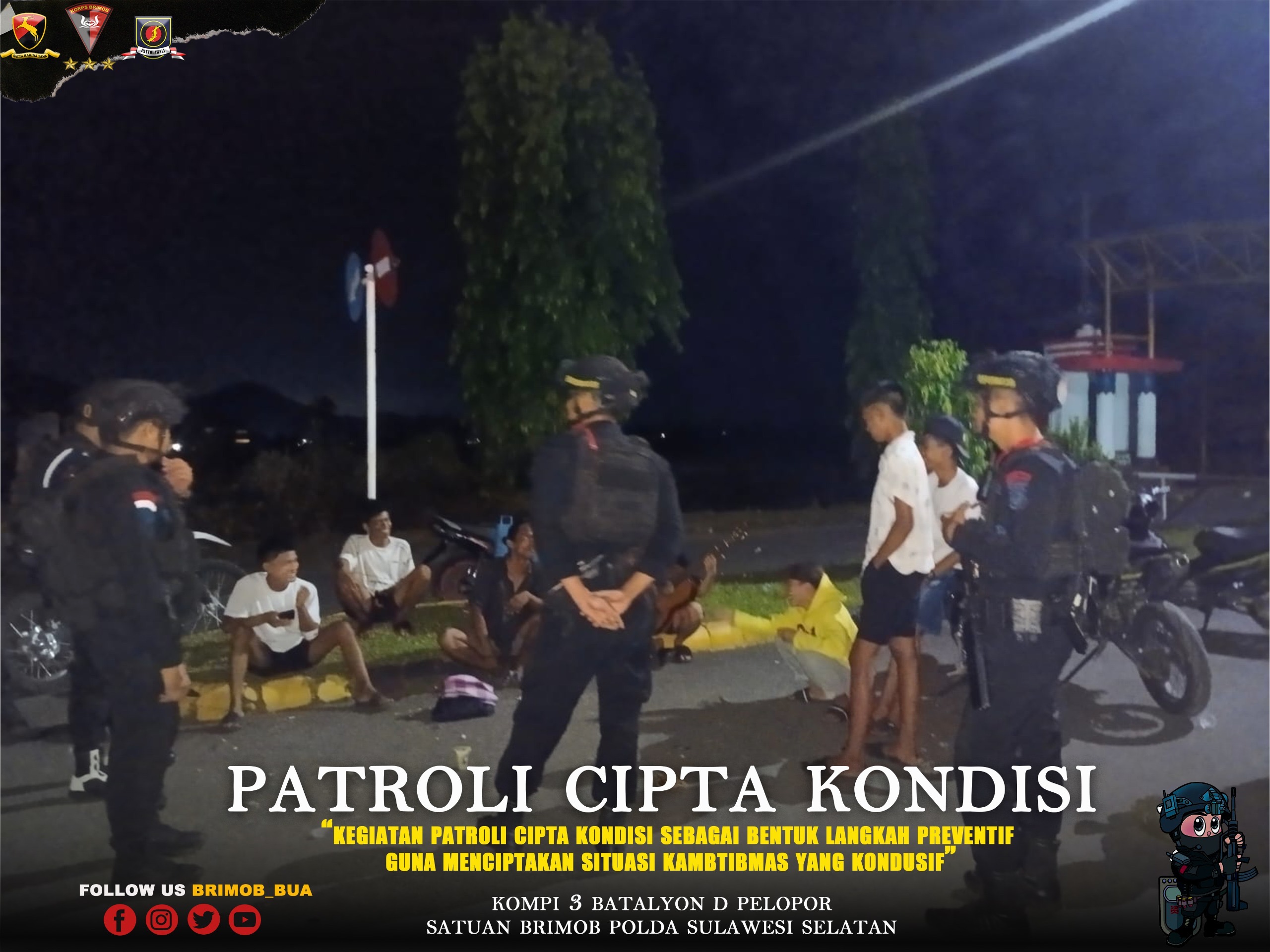 Dalam rangka menjaga stabilitas keamanan dan ketertiban masyarakat (kamtibmas), personel Kompi 3 Batalyon D Pelopor melaksanakan patroli cipta kondisi di wilayah hukum Polres Luwu, khususnya di Kecamatan Bua, pada malam hari.