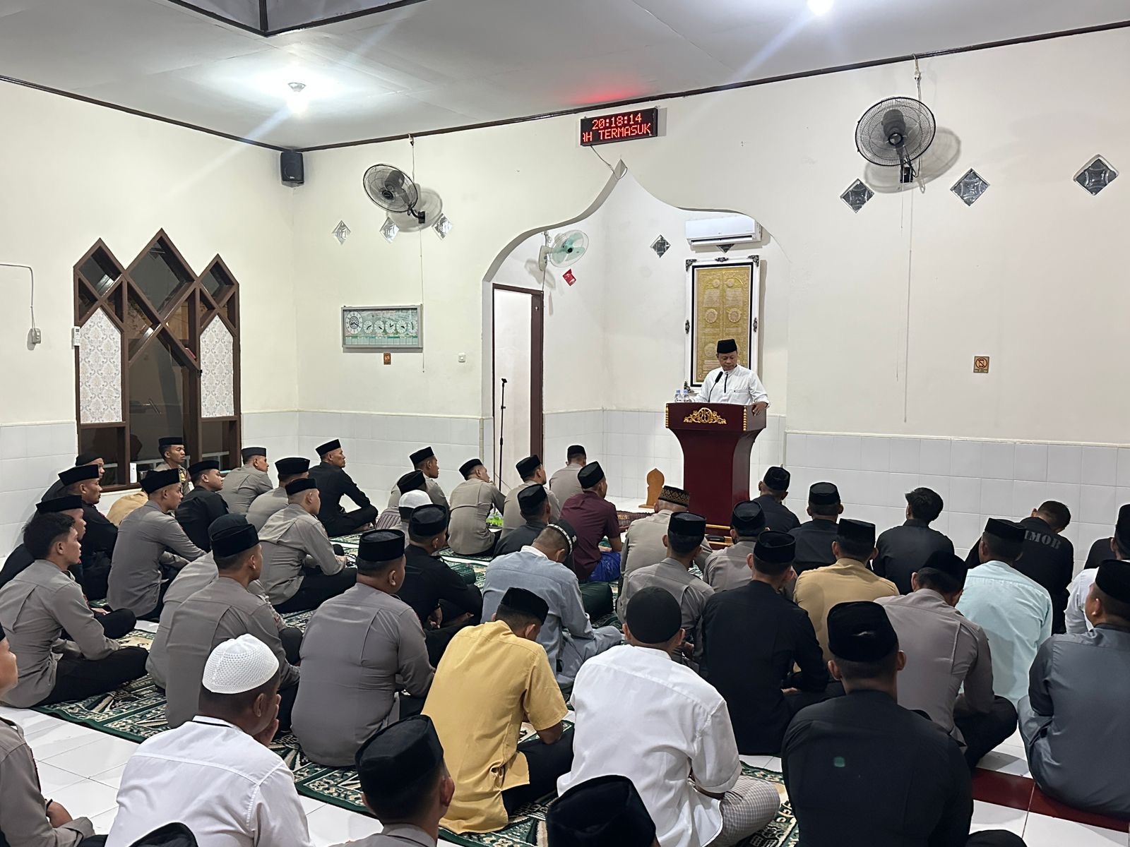 Usai sambutan, kegiatan dilanjutkan dengan pelaksanaan Shalat Tarawih yang dirangkaikan dengan Shalat Witir secara berjamaah pada pukul 20.30 WITA. Ibadah berlangsung dengan khusyuk, tertib, dan penuh kekhidmatan, mencerminkan semangat kebersamaan serta nilai-nilai religius yang senantiasa dijunjung tinggi oleh personel Batalyon D Pelopor.