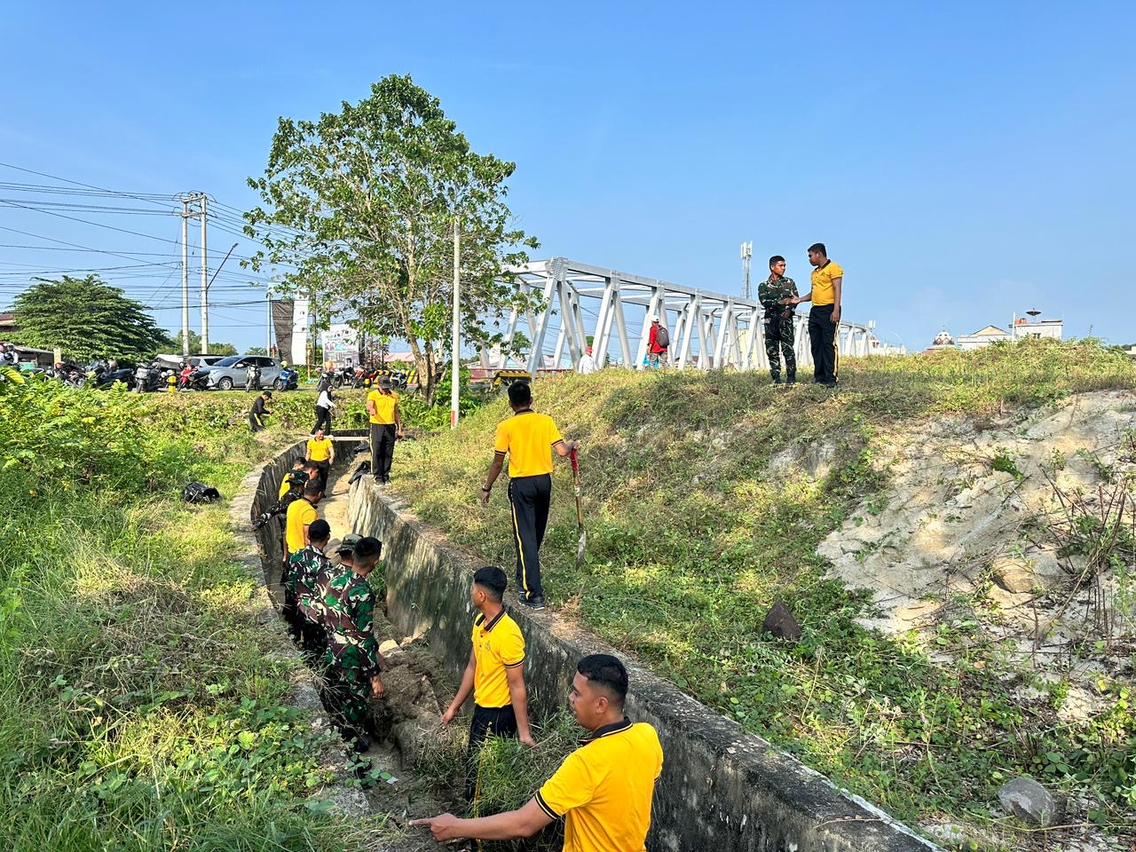 Masamba — Personel Batalyon D Pelopor Satuan Brimob Polda Sulawesi Selatan bersama TNI, Pemerintah Daerah Luwu Utara, dan masyarakat melaksanakan kegiatan gotong royong di kawasan Jembatan Masamba, Kelurahan Bone Tua, Kecamatan Masamba, Kabupaten Luwu Utara, Jumat (24/4/2026).