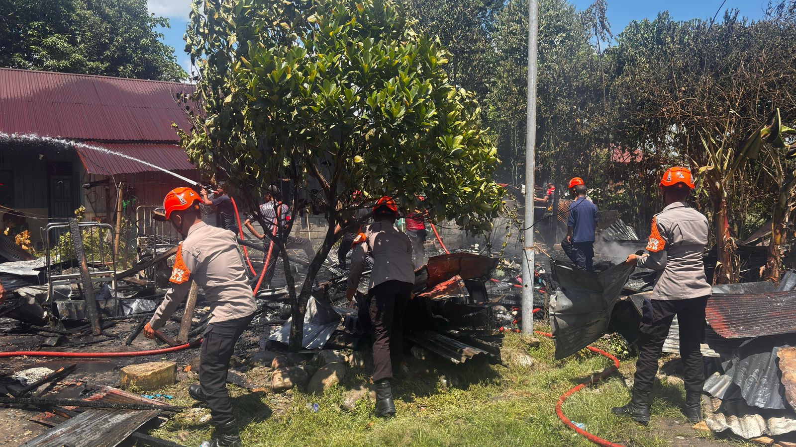 Kegiatan yang berlangsung sekitar pukul 11.30 WITA ini difokuskan pada pembersihan puing-puing sisa kebakaran guna mempercepat proses pemulihan lingkungan serta membantu masyarakat yang terdampak.